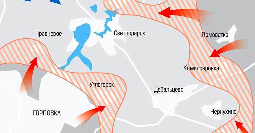 Стоит отметить тактическую гибкость командования ополченцев. Первоначальный замысел заключался в формировании большого котла с помощью сходящихся ударов на Попасную, Троицкое и Красный Пахарь со стороны ЛНР и Травневое, Светлодарск со стороны ДНР. Однако мощное сопротивление украинцев заставило изменить планы, а внезапное взятие Углегорска (украинцы проспали атаку малочисленной диверсионно-разведывательной группы) определило новый вектор «малого» окружения — в обхват самого Дебальцева.